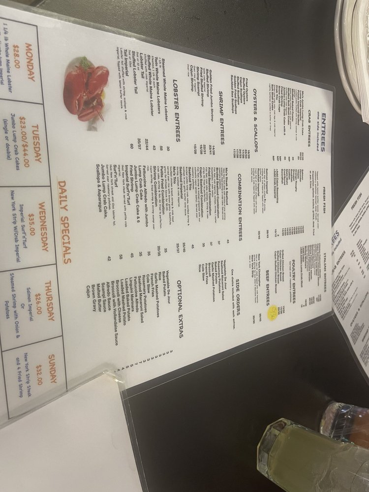 Fish filet, crab imperial, scallops, shrimp, 1 oyster Rockefeller, 1 clam casino